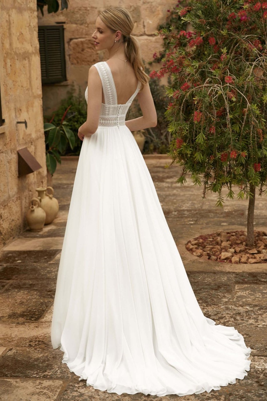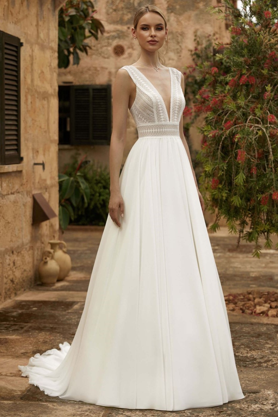 Boho wedding is the new trend and needs a beautiful sleeveless A-line wedding gown, Wendy. This dress has a V-neck at the front and a sexy open back.