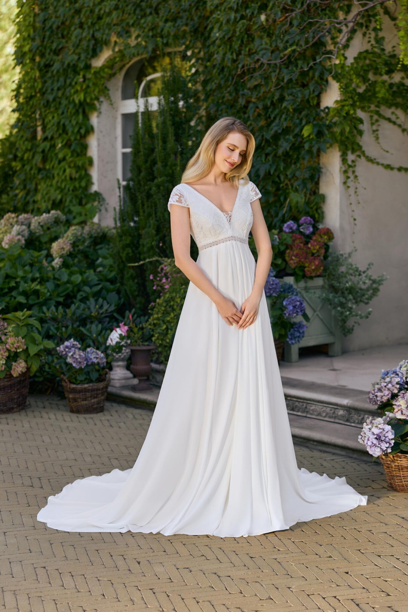 Angela Bianca 1148 is ontworpen rond een prachtig gevormde V-hals die de blik omhoog trekt en het gezicht, sleutelbeen en decolleté met een strakke verfijning omlijst. De V-halslijn zorgt voor een flatterend, verlengend effect, waardoor het favoriet is bij bruiden die een verfijnde maar vrouwelijke uitstraling willen. In combinatie met kanten details krijgt de jurk een romantische textuur die van dichtbij luxueus overkomt en van een afstand adembenemend is.