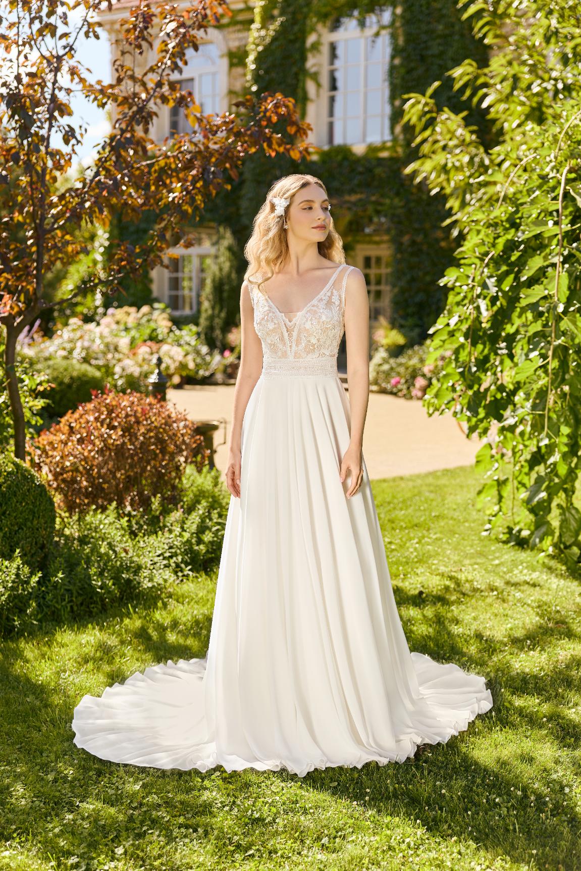 De Angela Bianca 1155 wordt gekenmerkt door de verfijnde combinatie van kantdetails, een flatterende V-halslijn en een open achterkant die een verfijnde vleugje drama toevoegt. De V-halsvorm verlengt de halslijn en omlijst het decolleté elegant, waardoor een universeel flatterend effect ontstaat dat past bij een breed scala aan bruidsesthetieken—van minimalistisch-chic tot romantisch en traditioneel. De open achterkant zorgt voor een opvallend focuspunt, met een verheven, couture-geïnspireerde afwerking die gedurfd maar prachtig bruidsachtig aanvoelt.