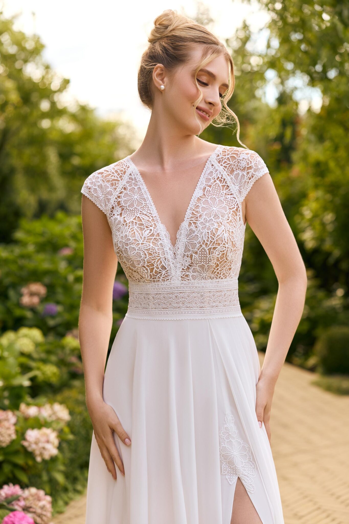 De V-hals draagt bij aan een verfijnd, verlengend effect, trekt de aandacht omhoog en omlijst het gezicht en decolleté met een strakke, flatterende lijn. Het resultaat is een harmonieuze silhouet die beheerst en romantisch aanvoelt, perfect voor bruiden die op zoek zijn naar een verfijnde look die jaar na jaar tijdloos blijft.