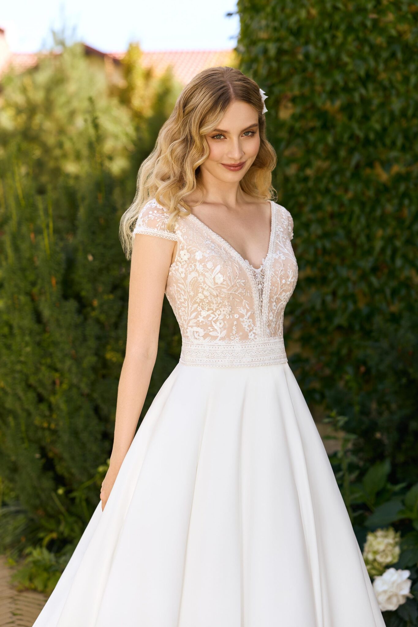 Het kanten ontwerp geeft textuur en diepte, waardoor het lijfje een romantische afwerking krijgt die onmiskenbaar bruidsachtig aanvoelt. Kant blijft favoriet voor trouwmode omdat het met diepte fotografeert en visuele interesse toevoegt zonder veel versiering. In combinatie met korte mouwen is de algehele uitstraling zowel sierlijk als praktisch. Korte mouwen zorgen voor een vleugje dekking terwijl de silhouet licht en luchtig blijft, waardoor dit lijfje geschikt is voor ceremonies in verschillende seizoenen. Het resultaat is een bruidsesthetiek die zacht, zelfverzekerd en moeiteloos chic aanvoelt.