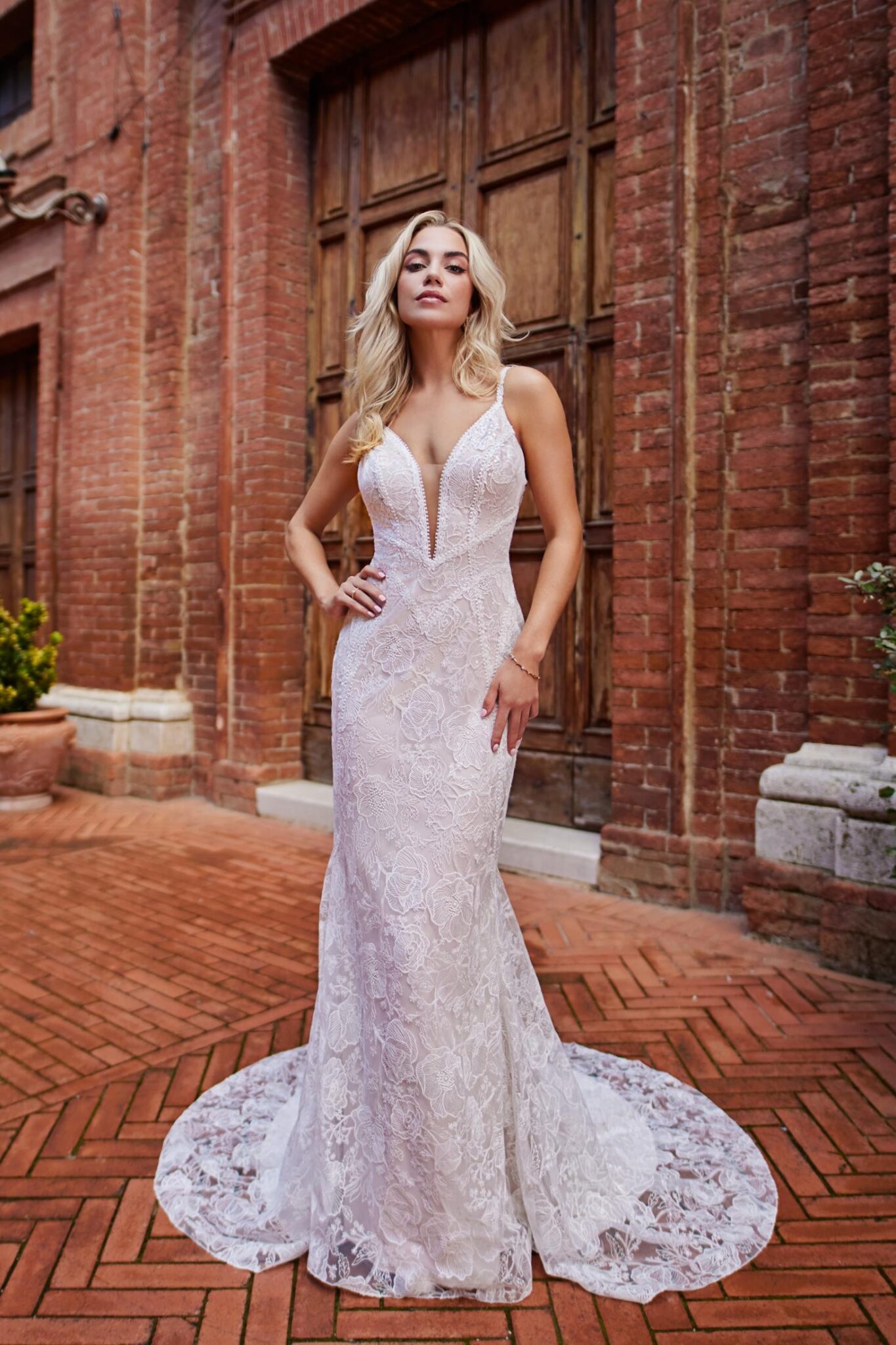 Brinkman 25412 valt op door een evenwichtige combinatie van textuur, vorm en aantrekkingskracht. De kanten details geven romantische diepte en visuele aantrekkingskracht, terwijl de zeemeermin-cut de taille en heupen benadrukt voordat het uitvloeit in een sierlijke afwerking. Deze structuur creëert een zelfverzekerd, door rode loper geïnspireerd profiel zonder de zachtheid te verliezen die bruiden in een trouwjurk liefhebben.