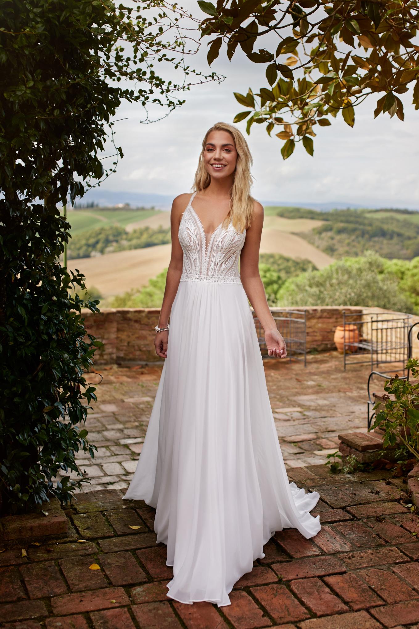 Als je op zoek bent naar een ivoorkant trouwjurk met een V-hals en open rug, brengt Brinkman 25416 die gewilde elementen samen in één samenhangend ontwerp. Het biedt een bruidslook die romantisch, zelfverzekerd en verfijnd aanvoelt, waardoor het een betekenisvolle keuze is voor de dag die je voor altijd zult herinneren.