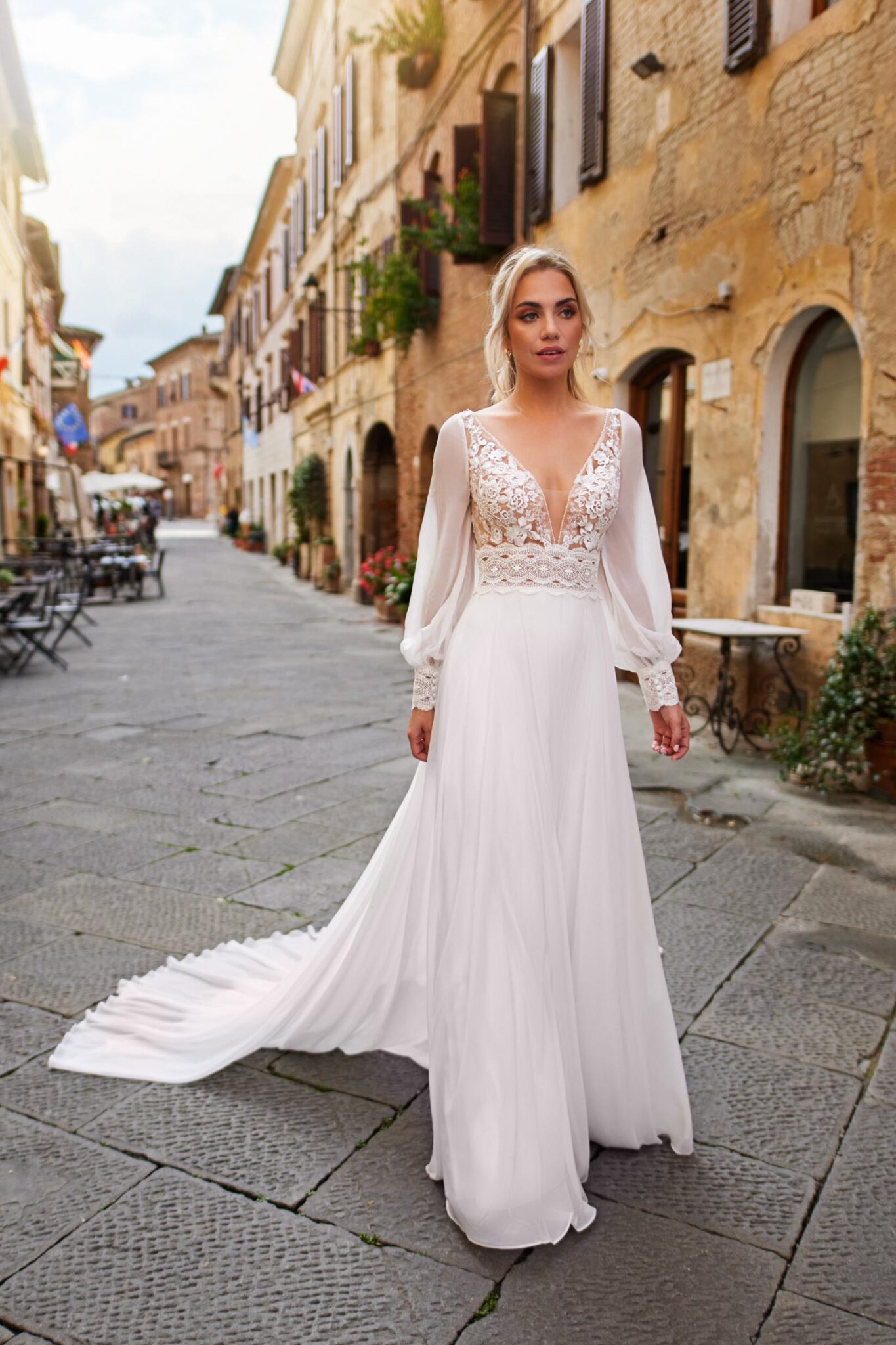 Het open achterontwerp geeft een moderne twist en zorgt voor een memorabel focuspunt terwijl je wegloopt van de ceremonie. Het is het soort kenmerk dat verfijnd en aantrekkelijk aanvoelt zonder de algehele verfijning van de jurk te verliezen. De toevoeging van mouwen balanceert de look met zachtheid en structuur, en biedt een romantische, gepolijste uitstraling waar veel bruiden van houden vanwege zowel ceremonie-elegantie als comfort gedurende de hele dag.