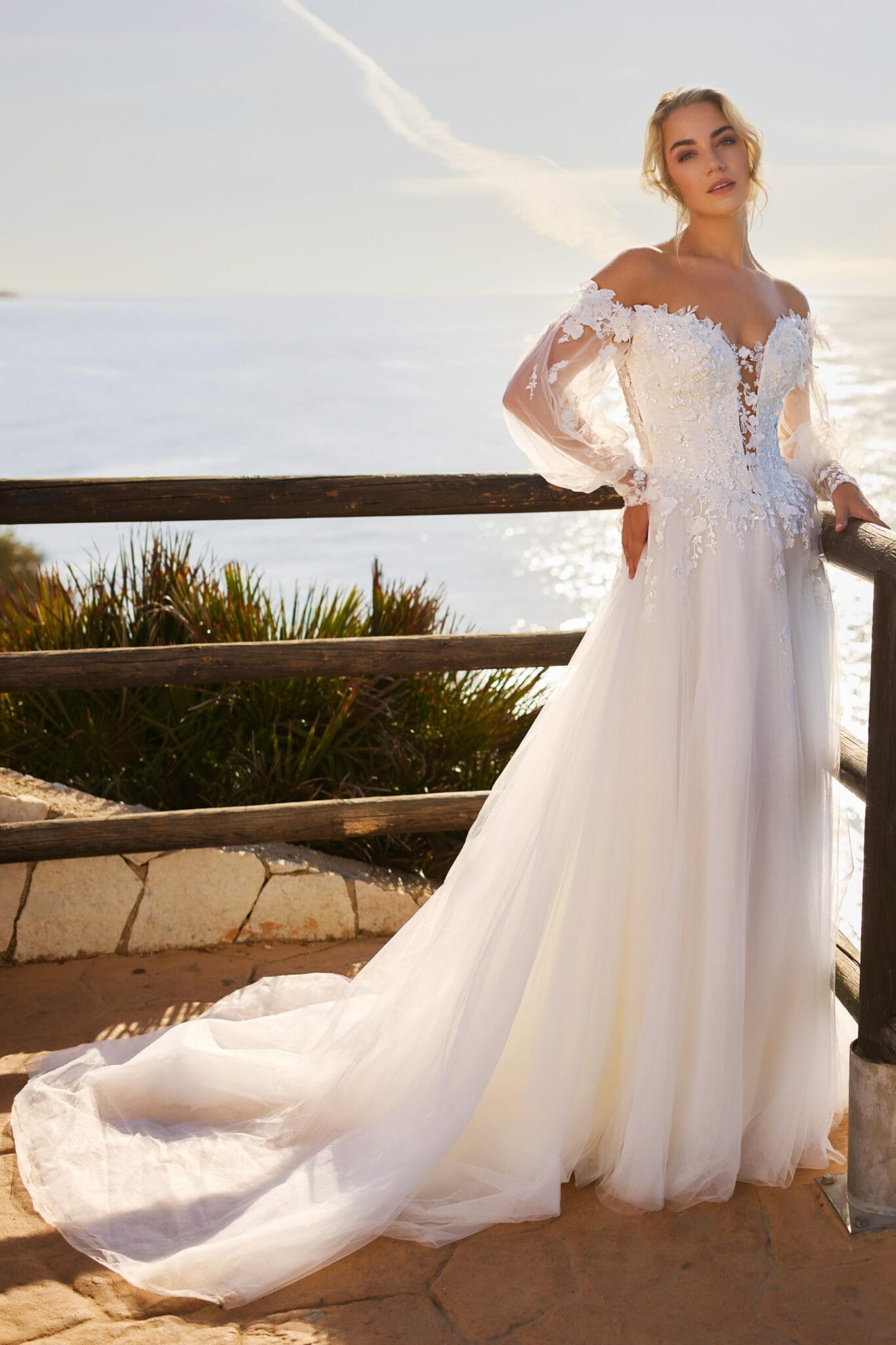 Kies de Brinkman 26205 bij Wedding Wonderland voor een bruidslook die zelfverzekerd, romantisch en onvergetelijk aanvoelt. Met ivoren elegantie, een flatterende off-shoulder, sweetheart-halslijn en de betoverende combinatie van kant en een speciale rug, is deze jurk gemaakt voor bruiden die tijdloze schoonheid met een onderscheidende signatuur willen.