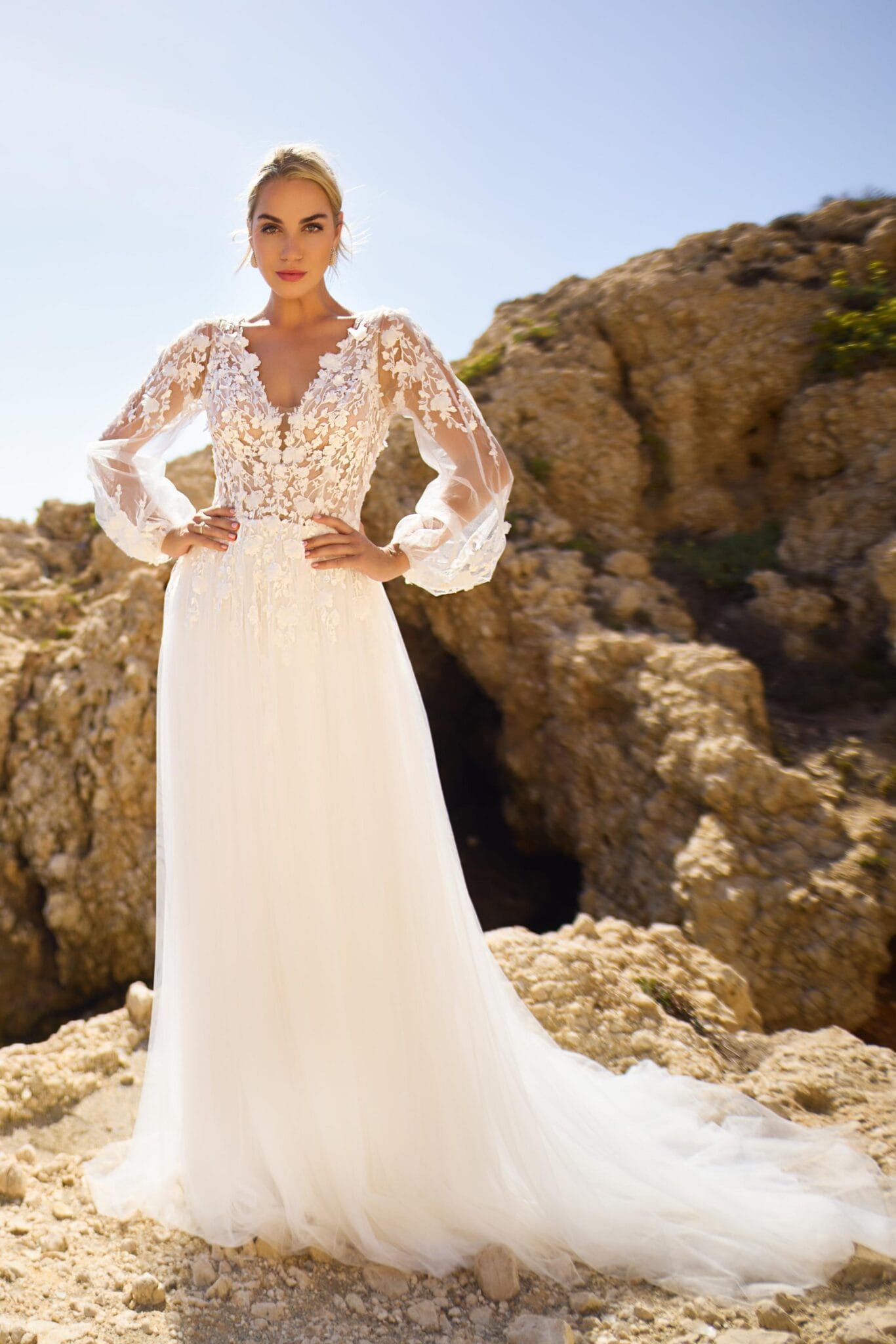 De toevoeging van mouwen maakt het ontwerp compleet met een verfijnde, moderne bruidstouch. Mouwen kunnen een gevoel van zelfvertrouwen en comfort bieden en tegelijkertijd een sierlijke lijn aan de armen toevoegen. Ze laten het kant ook op een bijzonder romantische manier stralen, waardoor de hele jurk vanuit elke hoek doordacht ontworpen aanvoelt. Samen vormen deze elementen een trouwjurk die actueel, vrouwelijk en onmiskenbaar bruidsachtig aanvoelt.