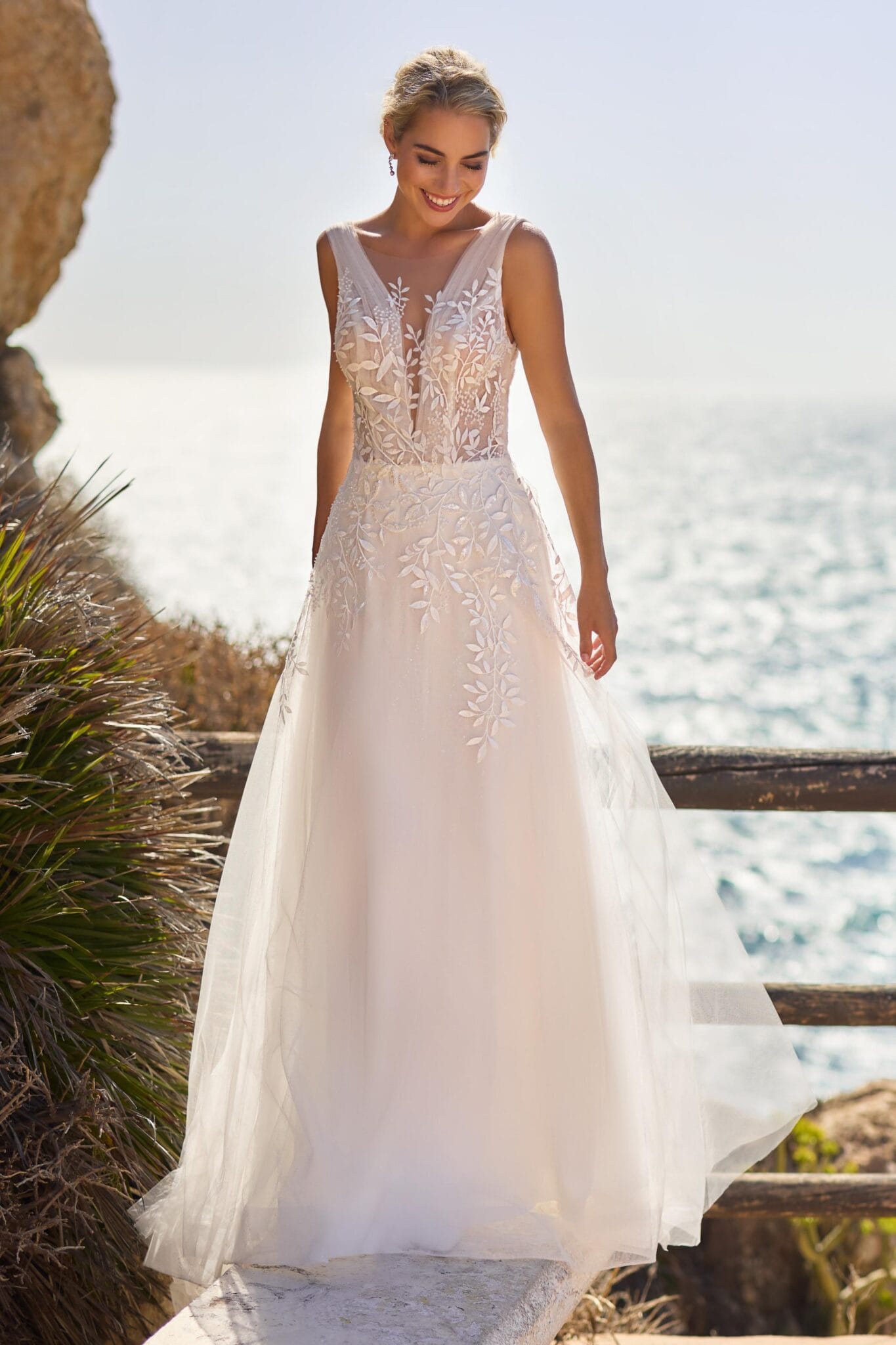 De Brinkman 26416 wordt gekenmerkt door zijn evenwichtige combinatie van zachtheid en structuur. De V-hals vormt een verlengende lijn door het lijfje, waardoor het oog omhoog wordt getrokken en de halslijn op een universeel flatterende manier wordt omlijst. Deze snit geeft een moderne uitstraling en blijft tijdloos, waardoor het een sterke keuze is voor bruiden die elegantie zonder overdaad willen.