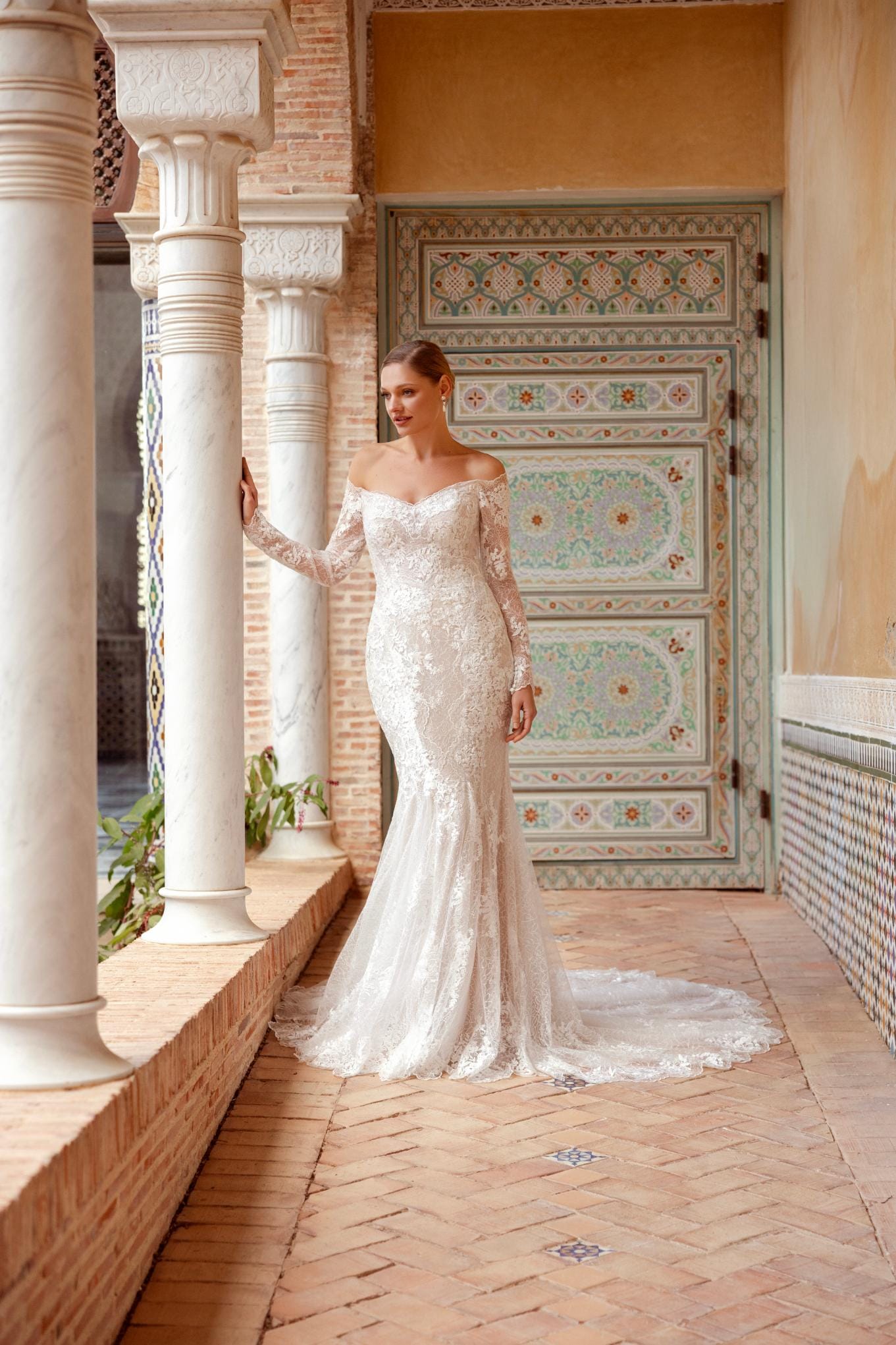 De jurk heeft ook mouwen, wat verfijning en structuur toevoegt terwijl het een zachte, romantische flow behoudt. Mouwen kunnen een gevoel van evenwichtigheid en zelfvertrouwen geven, vooral voor bruiden die een meer gepolijste, modieuze afwerking willen zonder comfort op te offeren. Samen vormen de off-shoulder halslijn, mouwen en open rug een harmonieus ontwerp dat zowel tijdloos als trendy aanvoelt.