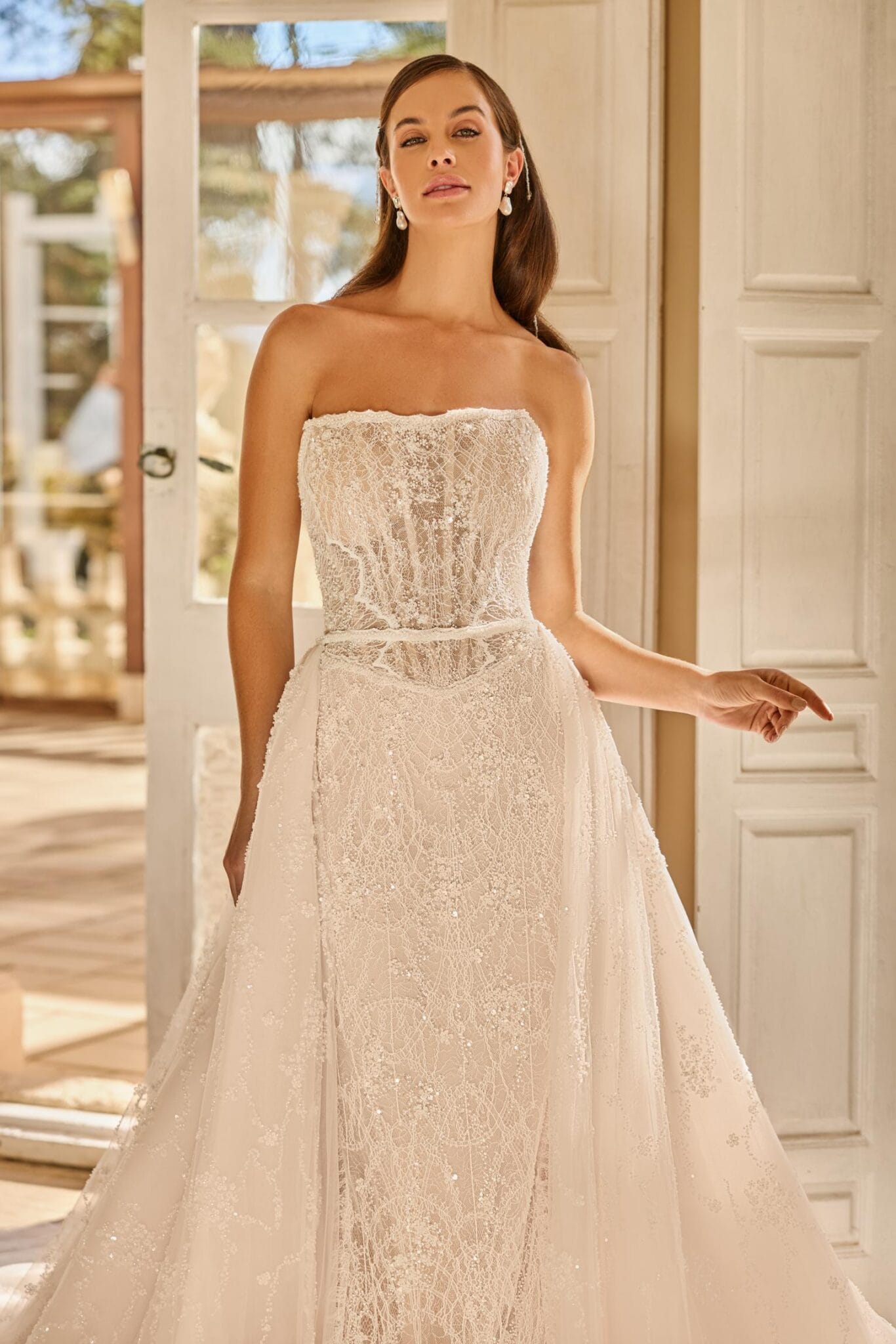 Bij Wedding Wonderland raden we dit stuk aan voor bruiden die houden van strakke lijnen gecombineerd met een romantische textuur. Stijl het met een boothals top voor een elegante, modieuze uitstraling, en houd accessoires verfijnd zodat de kant en ivoorkleurige tint kunnen uitblinken. Of je trouwthema nu modern city chic, klassiek romantisch of destination minimalisme is, de Monica Loretti 8375 Bottom is een geïnspireerde keuze die tijdloze schoonheid met eigentijdse flexibiliteit biedt.