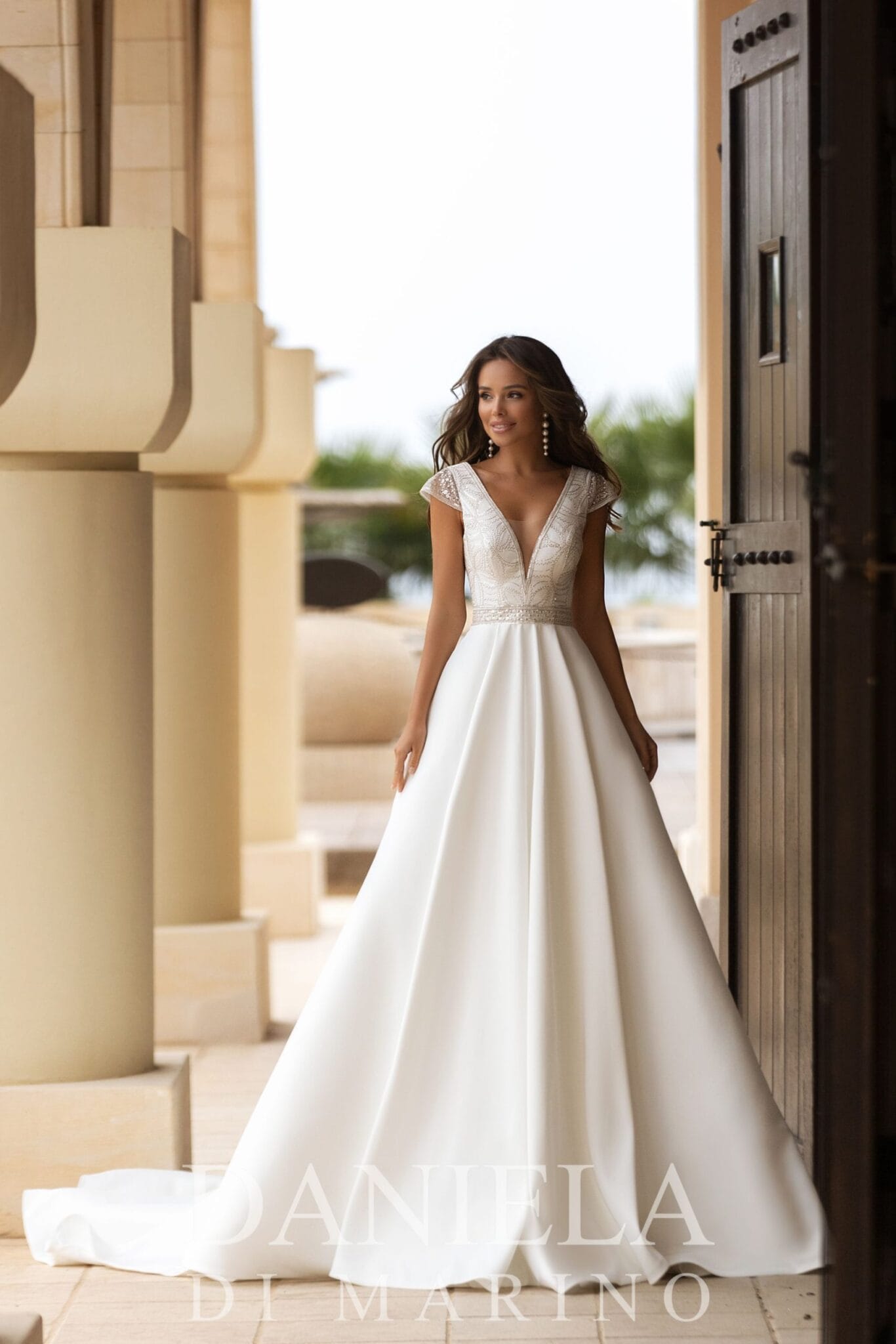 De Daniela di Marino 6313 Sale, uitgevoerd in ivoor, levert een klassieke bruidskleur die er stralend uitziet in natuurlijk licht en binnenshuis. Ivoor is geliefd om zijn warme, flatterende afwerking en past prachtig bij verschillende huidtinten en trouwpaletten. Het past bij alles, van neutrale, minimalistische decors tot weelderige bloemen en recepties met kaarslicht, zodat je look samenhangend en tijdloos blijft.