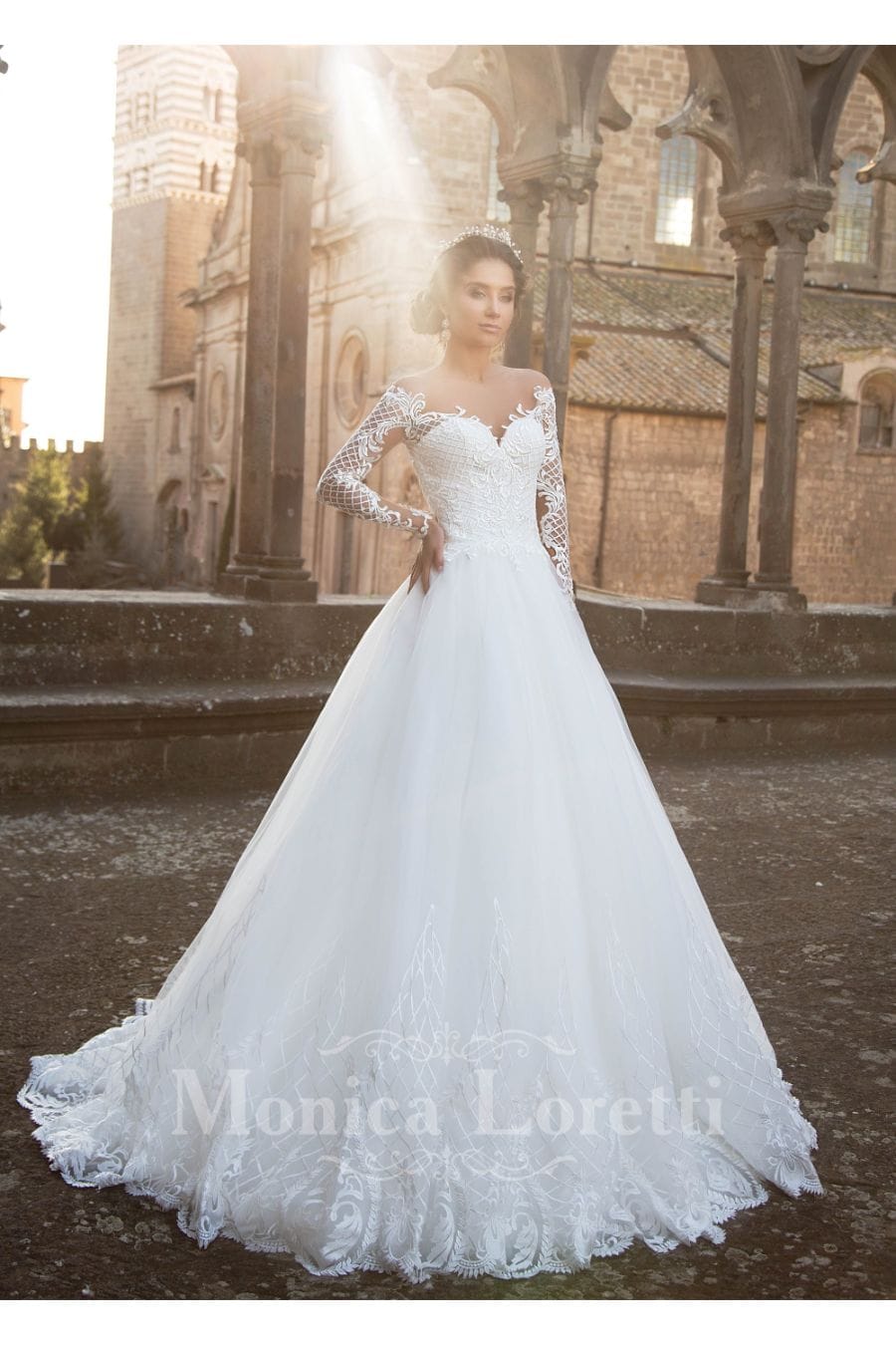 Laat je wandeling naar het altaar moeiteloos en buitengewoon voelen met de Monica Loretti Olson Sale trouwjurk, verkrijgbaar via de sample sale trouwjurken van Wedding Wonderland.