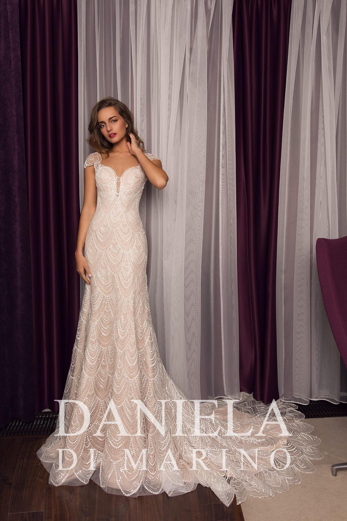 Textuur en details spelen een grote rol in wat de Daniela di Marino Elda Sale zo onvergetelijk maakt. Kant brengt zachtheid, kunstzinnigheid en een couturegevoel dat de hele look verheft, terwijl het element met korte mouwen een verfijnde touch toevoegt waar veel bruiden dol op zijn vanwege de flatterende bedekking en verfijnde afwerking. Samen creëren deze kenmerken een romantische esthetiek die zowel draagbaar als onderscheidend is, perfect voor bruiden die een jurk willen die vanuit elke hoek bijzonder aanvoelt.